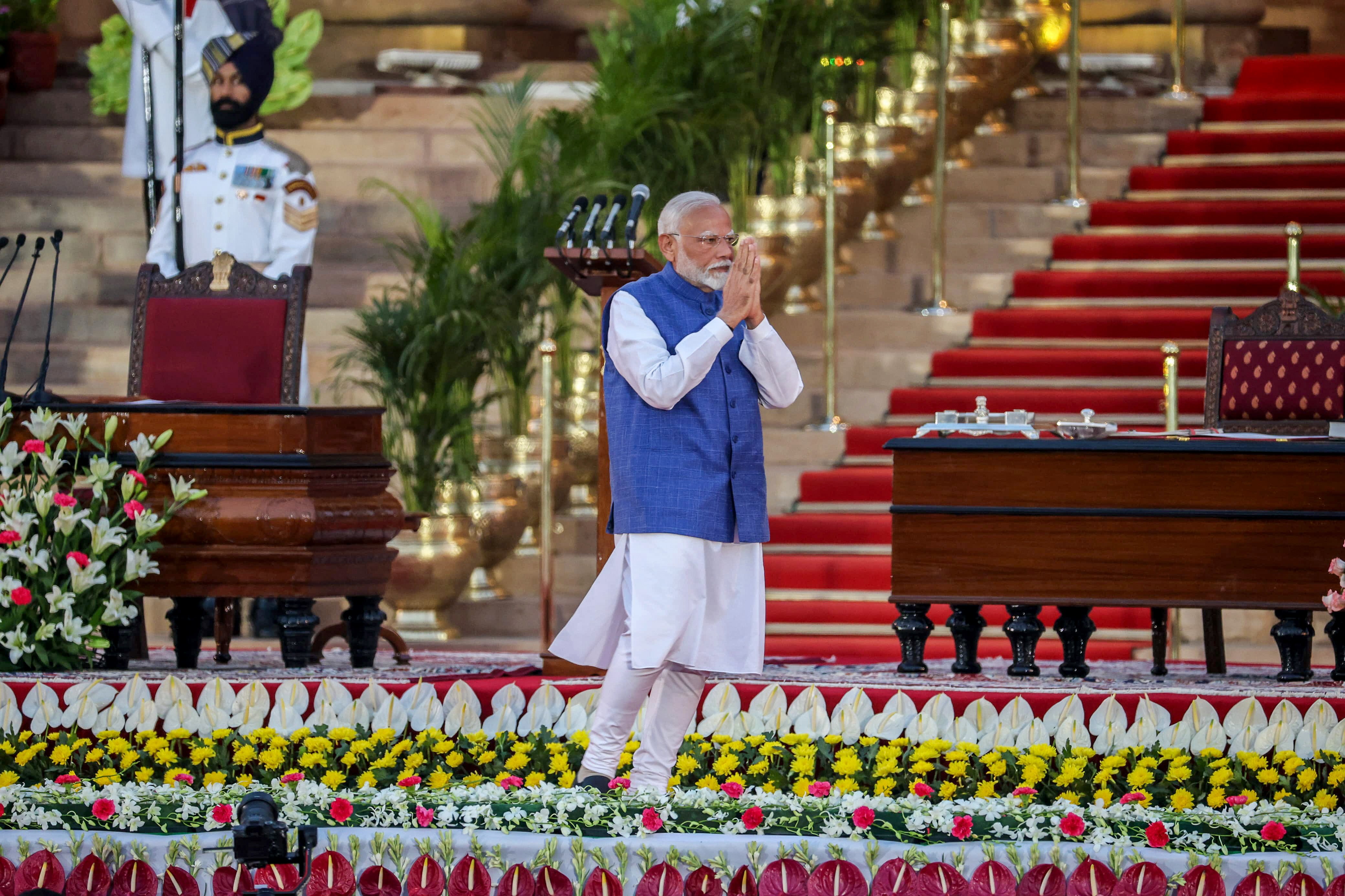 New Delhi (India), 09/06/2024.- India's Bharatiya Janata Party (BJP) leader, Narendra Modi arrives to take oath as India's prime minister during the swearing-in ceremony at the presidential palace in New Delhi, India, 09 June 2024. Indian Prime Minister Modi, 73, has been sworn in for a third consecutive term after the BJP and its alliance party scored a majority in the parliamentary elections, which were held over seven phases between 19 April and 01 June 2024. (Elecciones, Nueva Delhi) EFE/EPA/RAJAT GUPTA