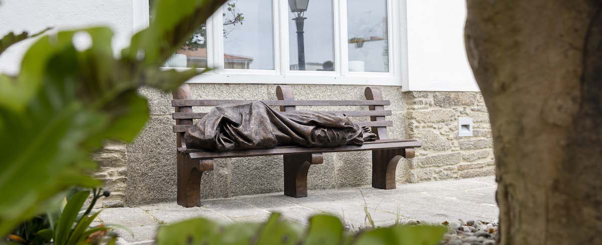 Allí, donde culmina el Camino de Santiago y se recibe la “Compostella”, los peregrinos que lleguen a la ciudad podrán ser testigos de una instalación que conmueve y cuestiona. La obra representa a Jesús envuelto en una manta, acostado en un banco público, con el rostro oculto. La única señal de su identidad son las llagas visibles en sus pies.