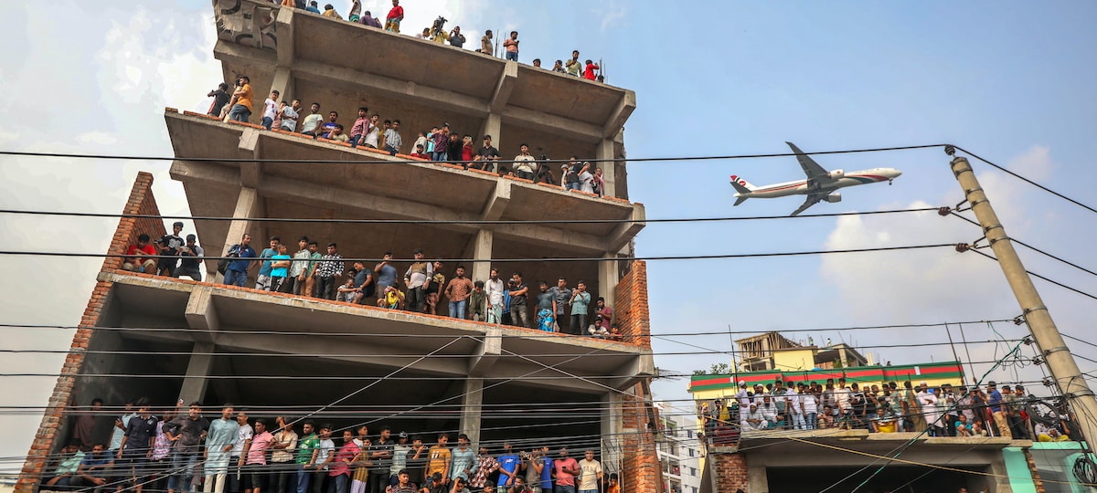 Dhaka (Bangladesh), 21/07/2025.- People gather near the site where an air force training aircraft crashed into Milestone College campus, in Dhaka, Bangladesh, 21 July 2025. According to the Fire Service and Civil Defense Director General, Brigadier General Muhammad Jahed Kamal, 19 bodies were recovered from the school compound and many more are injured. EFE/EPA/MONIRUL ALAM