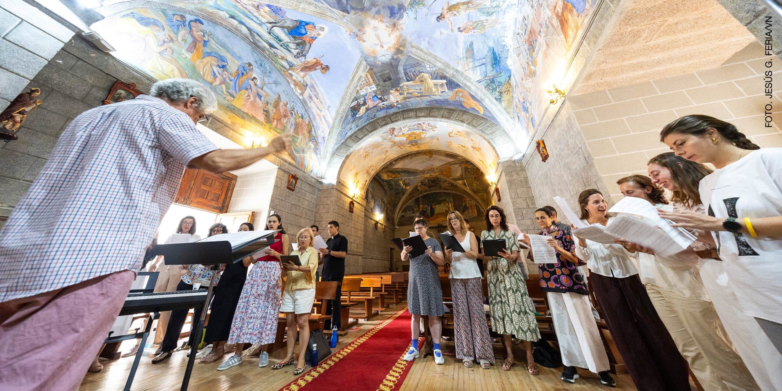 Subimos y bajamos escaleras, y detrás de cada puerta aguarda una sorpresa. La de ver a Ignacio Yepes, por ejemplo, ensayando en la capilla, con su taller a pleno pulmón. Desde el fondo, sentados con la espalda pegada a la pared, vuelven hacia atrás en el tiempo. Al siglo XIII. Se escucha la ‘Cantiga 179’ de Alfonso XI el Sabio. El maestro, que también es flautista y compositor, dirige con las manos y todo el grupo canta como si fuera una sola voz. Repiten una y otra vez con nuestros ojos y las bellísimas pinturas que adornan el techo como testigos mudos. El taller es de voz y de instrumentos también.