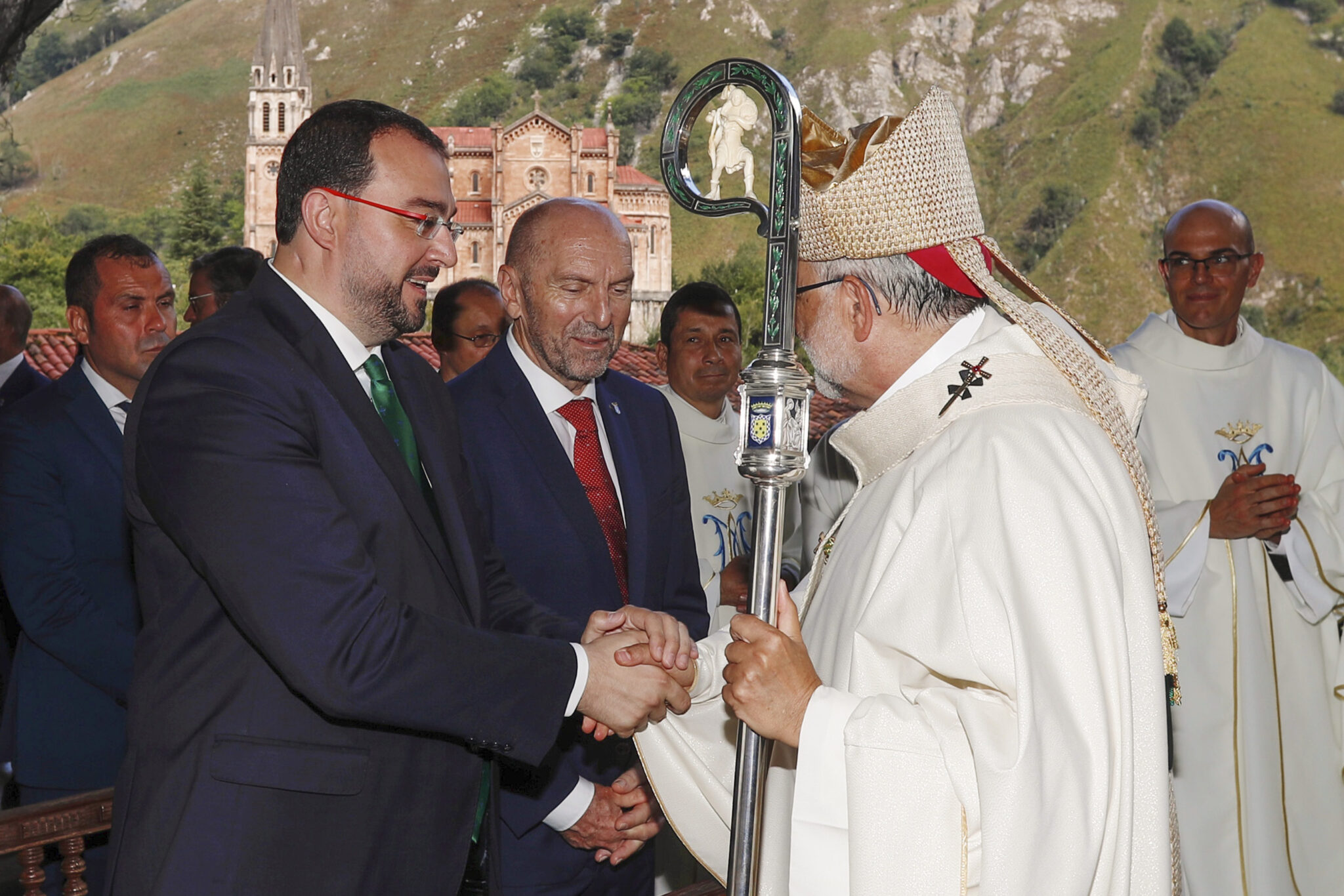 08/09/2023. - Covadonga (Principado de Asturias). El presidente del Principado, Adrián Barbón? (i)? saluda Arzobispado de Oviedo, Jesús Sanz?i durante los actos organizados en el Santuario de Nuestra Señora de Covadonga con motivo del Día de Asturias. EFE/Paco Paredes