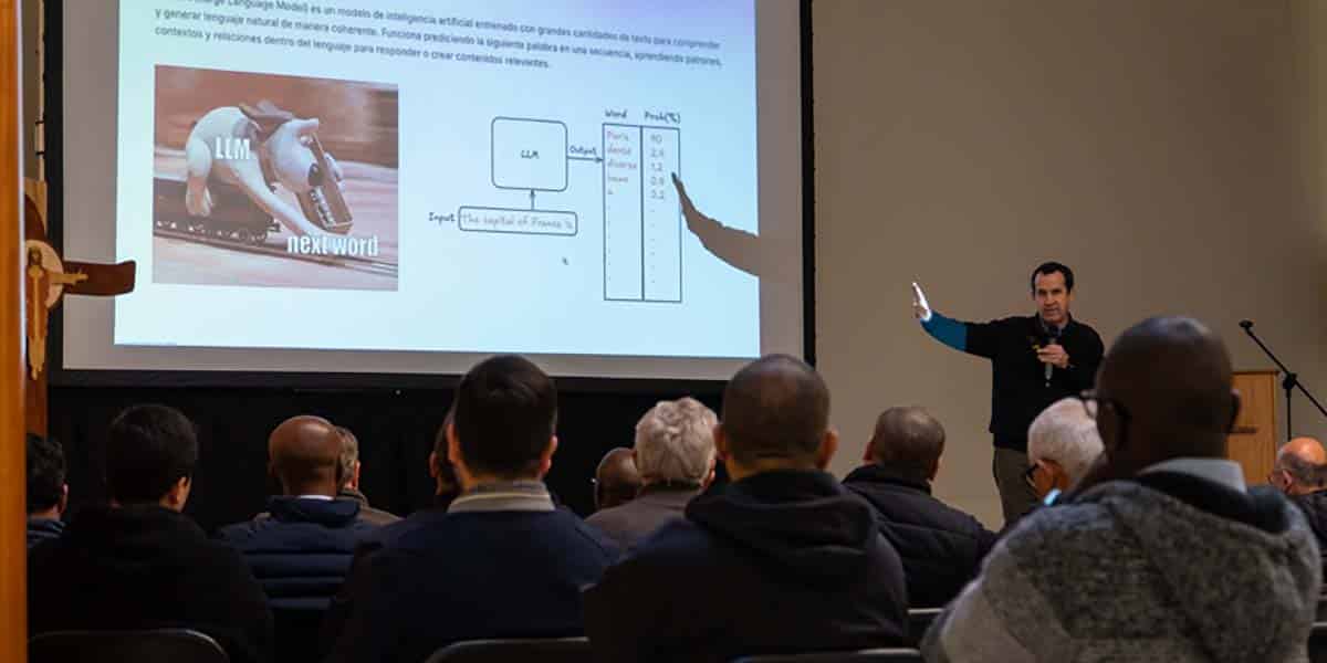 Con el título “IA Generativa y agéntica: desafíos y posibilidades”, el profesor Vergara presentó herramientas que la IA ofrece y pueden ser aplicadas al quehacer pastoral. En su charla, Vergara mostró ejemplos de aplicación en actividades tan diversas como son la preparación de homilías o en la gestión parroquial.