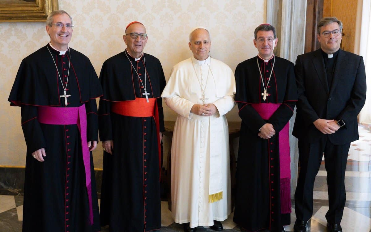 El papa León XIV con el cardenal Juan José Omella y los obispos auxiliares de Barcelona, Javier Vilanova y David Abadías, y su secretario, Marc Labori