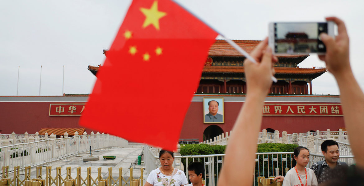 Un grupo de personas se fotografía frente a la puerta de Tiananmen en Pekín