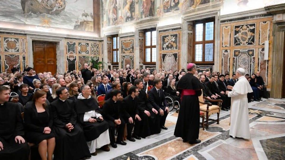 “Me alegra darles la bienvenida a Roma con ocasión de su peregrinación en este Año Jubilar centrado en la virtud teologal de la esperanza”, comenzó el Papa. “Ruego para que, al visitar los lugares santos, su esperanza en las promesas del Señor se fortalezca y puedan regresar a casa llenos de alegría, dispuestos a compartir su fe proclamando el Evangelio con sencillez cada día”.