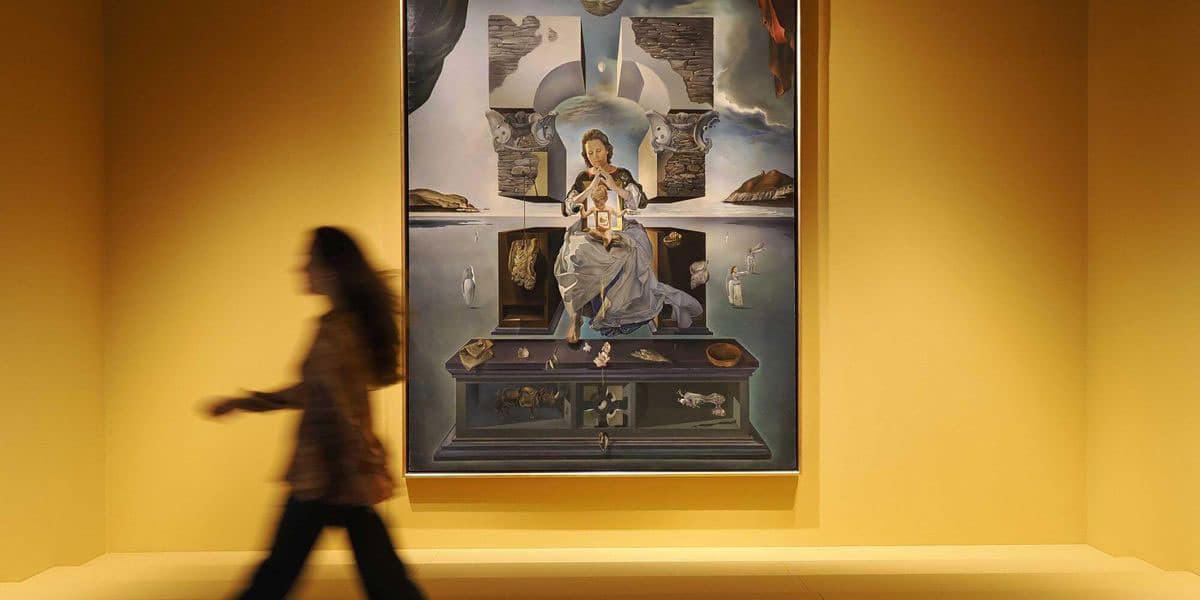 Gala transmutada en una Virgen que mira hacia abajo, lo mismo que el Niño. Y ambos suspendidos en el aire. La puesta en escena de ‘La Madona de Portlligat’, uno de los cuadros más emblemáticos y reconocibles de Salvador Dalí, es absolutamente teatral (a los cortinajes que se ven en los extremos de la obra me remito), empezando por sus medidas, con una altura que casi roza los tres metros, y corresponde a un momento concreto en su ejecución.
