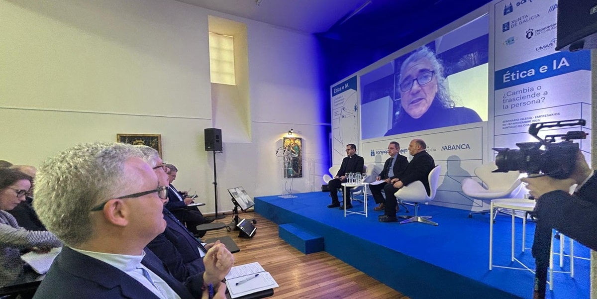 “¿Qué hace el Papa y el arzobispo de Santiago de Compostela hablando de Inteligencia Artificial?”. Con esta sana provocación lanzada por José Ramón Amor Pan, arrancó el coloquio del seminario ‘Ética e IA: ¿cambia o trasciende a la persona?’, organizado por la Archidiócesis gallega con la colaboración de Abanca y Umas Seguros.