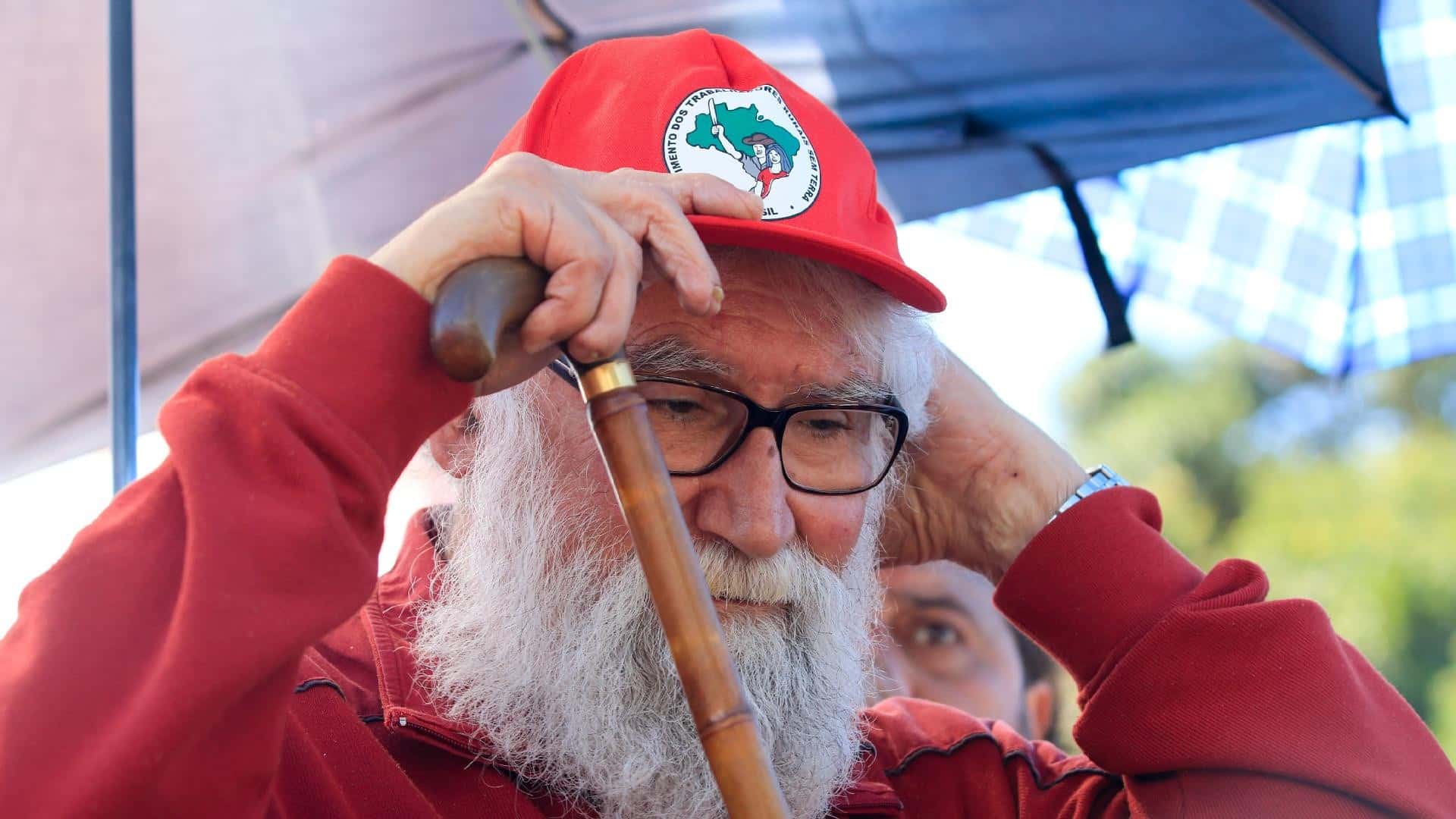 El teólogo brasileño Leonardo Boff portando una gorra del Movimiento de los Trabajadores Rurales Sin Tierra (MST) de su país