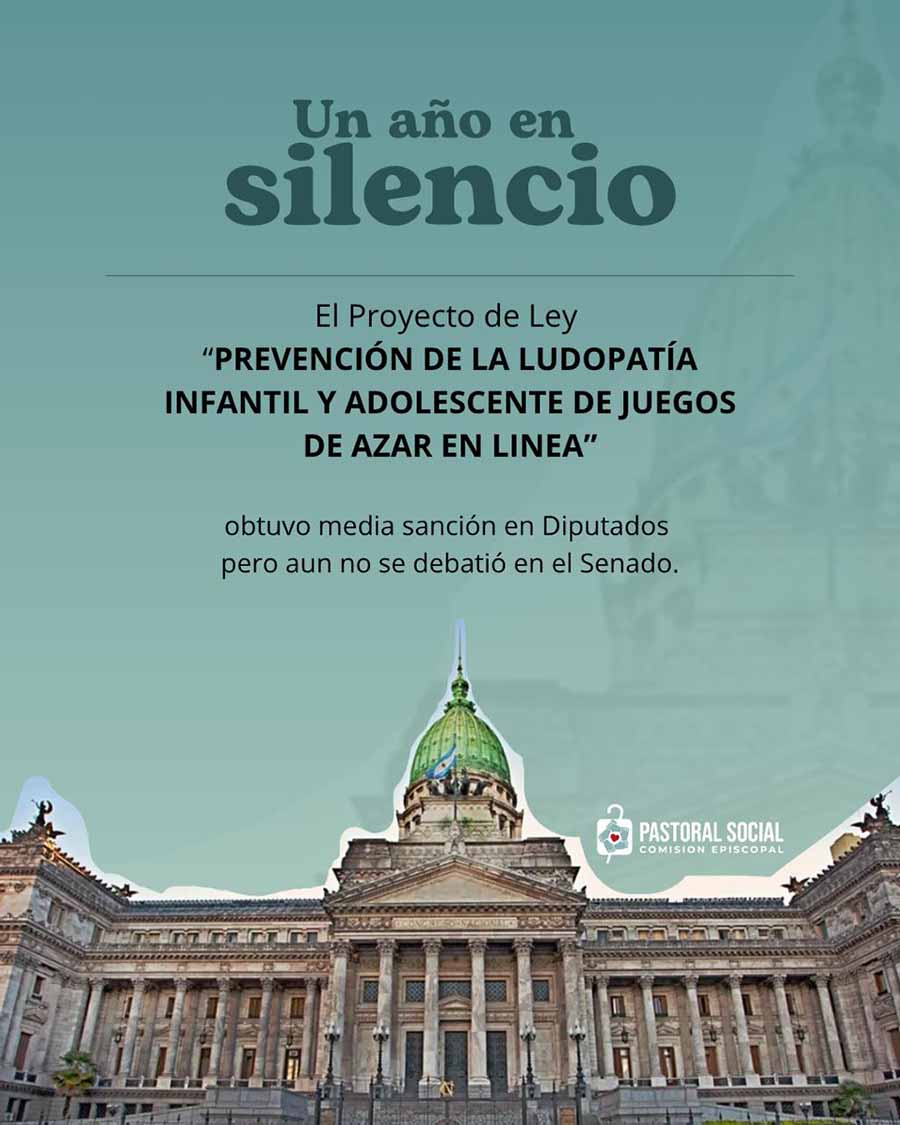 La Comisión Episcopal de Pastoral Social de la Conferencia Episcopal Argentina confirmó que la Honorable Cámara de Senadores de la Nación no ha llevado a debate en el recinto el proyecto de ley sobre ludopatía y apuestas online, que ya cuenta con media sanción.