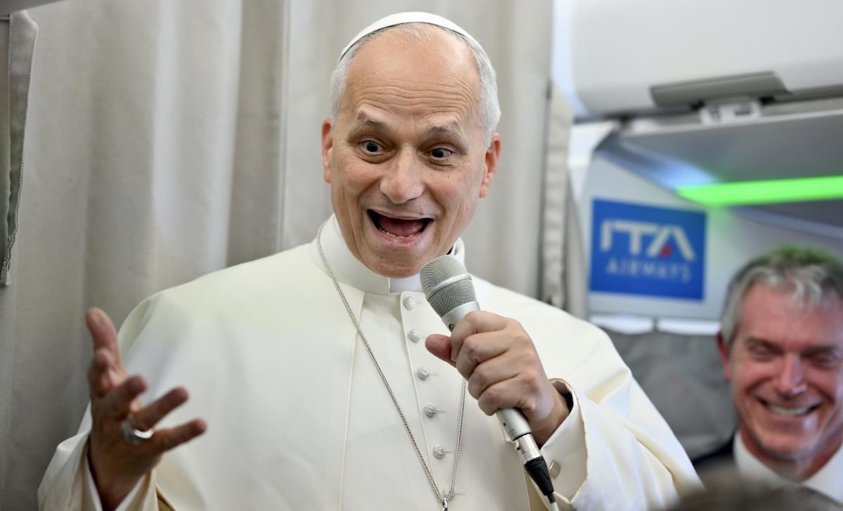 ZZZ (-), 02/12/2025.- Pope Leo XIV speaks to journalists aboard a flight to Rome at the end of his apostolic journey, following his departure from Beirut, Lebanon, 02 December 2025. The apostolic journey to Turkey and Lebanon was Pope Leo XIV's first international trip from 27 November until 02 December 2025. (Papa, Líbano, Turquía, Roma) EFE/EPA/ALESSANDRO DI MEO / POOL