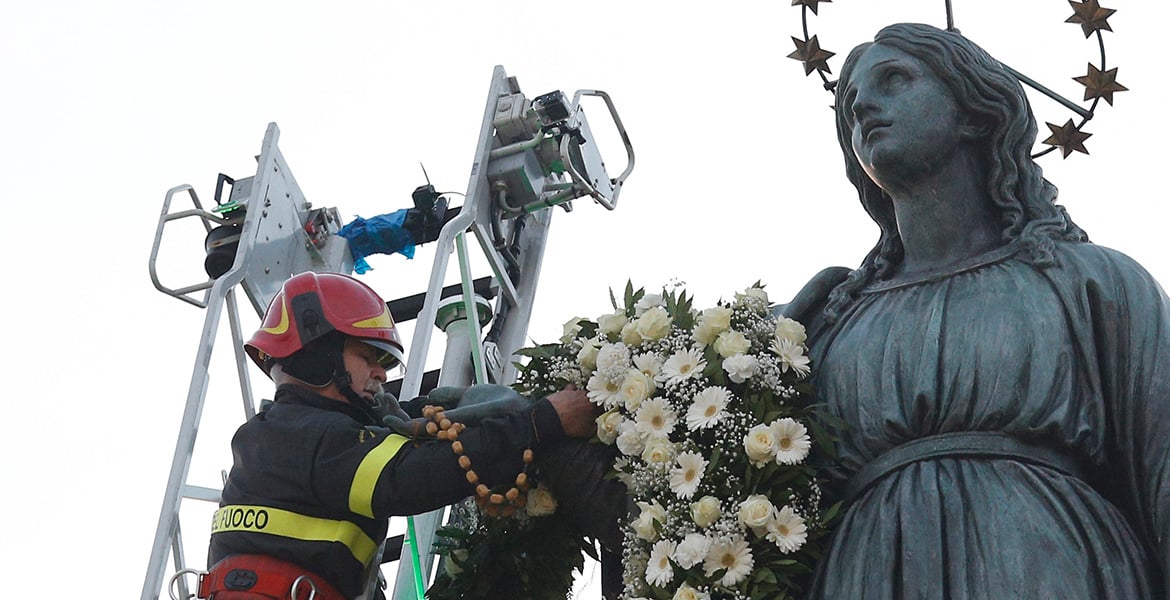 No obstante, los primeros en presentar sus respetos a la Virgen serán los bomberos, en honor a los 220 colegas que inauguraron el monumento en 1857, que depositarán sus coronas de flores en el brazo de la Inmaculada Concepción, que se encuentra a 12 metros de altura, en el monumento diseñado por el arquitecto Luigi Poletti, y coronada por la estatua de bronce del escultor Giuseppe Obici.