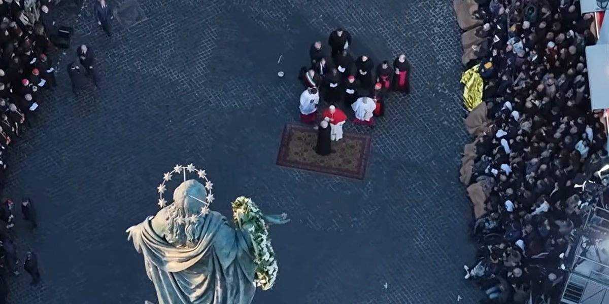 El Pontífice llegó a la Plaza de España a bordo del papamóvil en torno a las cuatro de la tarde, donde fue recibido por el alcalde de Roma, Roberto Gualteri, y por el cardenal vicario, Baldassare Reina. Flanqueado por el sustituto de Secretaría de Estado, Edgar Peña Parra, el Papa rezó en silencio ante la escultura, que portaba una corona de rosas blancas que por la mañana depositaron los bomberos de Roma.