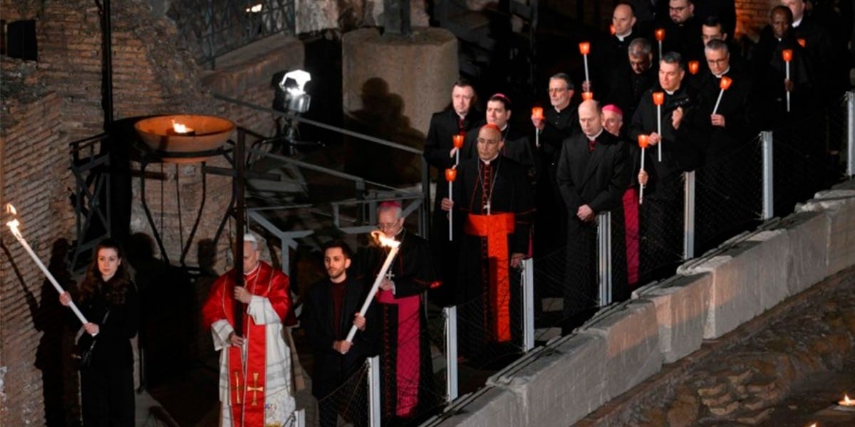 A las 21.15 h. de esta noche de Viernes Santo, el papa León XIV presidió el tradicional Vía Crucis en el majestuoso escenario del Coliseo de Roma. Esta solemne oración en el entorno del anfiteatro Flavio y los Foros Imperiales contó en esta ocasión con el propio pontífice portando la cruz a lo largo del recorrido trazado, como hiciera en gran parte del recorrido Benedicto XVI en su primer Via Crucis como Papa que permaneció, en cualquier caso, siempre junto a la cruz. Lo ha hecho llevando roquete y la muceta roja papal con estola. Por su parte, desde el Vicariato de Roma han acompañado al pontífice el cardenal vicario y los obispos auxiliares, mientras dos jóvenes, que iban cambiando, han sido los portadores de las antorchas junto a la cruz. Un séquito eminentemente clerical en el que se ha incluido solo dos mujeres llevando las antorchas.