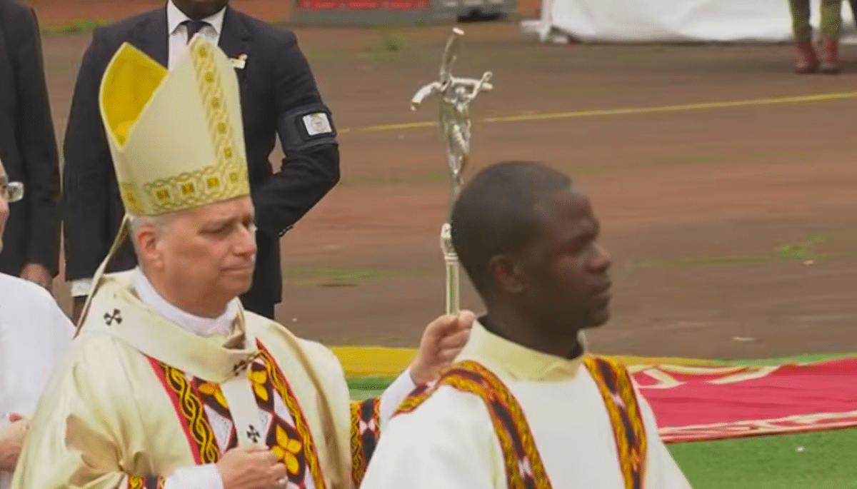 León XIV llega a la celebración de la eucaristía en el aeropuerto de Bamenda. Foto: Vatican Media