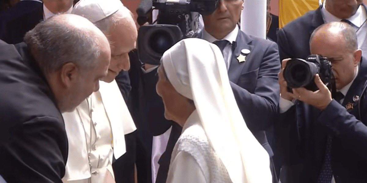 León XIV saluda a una religiosa durante su visita a una residencia ancianos Angola. Foto: Vida Nueva