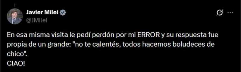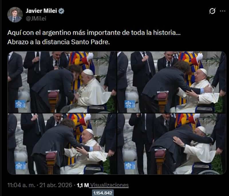 Más allá de sus diferencias, en su red social X, publicó imágenes sobre el encuentro que mantuvo con el Pontífice. Agregó, además, dos frases: “Aquí con el argentino más importante de la historia” y “abrazo a la distancia Santo Padre”.