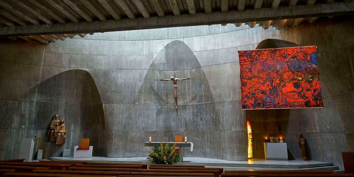 La iglesia que levantó Fisac a mediados de los años 60 es un prodigio del brutalismo, un alarde de hormigón que no presume de nada más que de ser materia, que habla desde el silencio del templo de Dios.