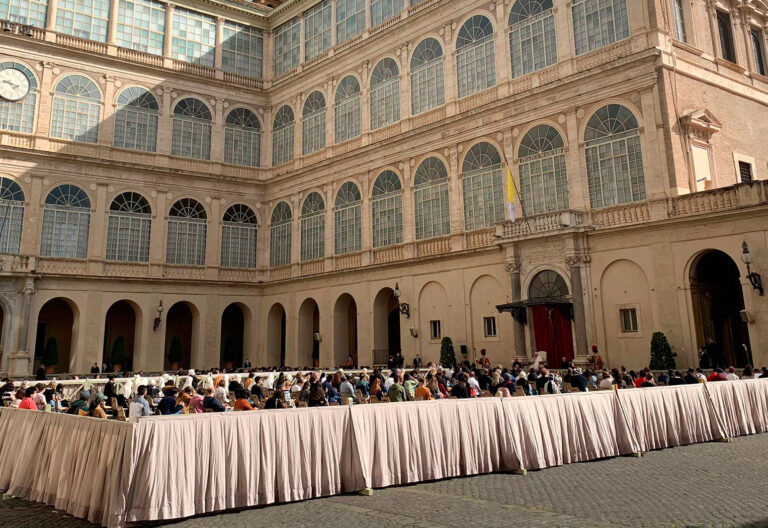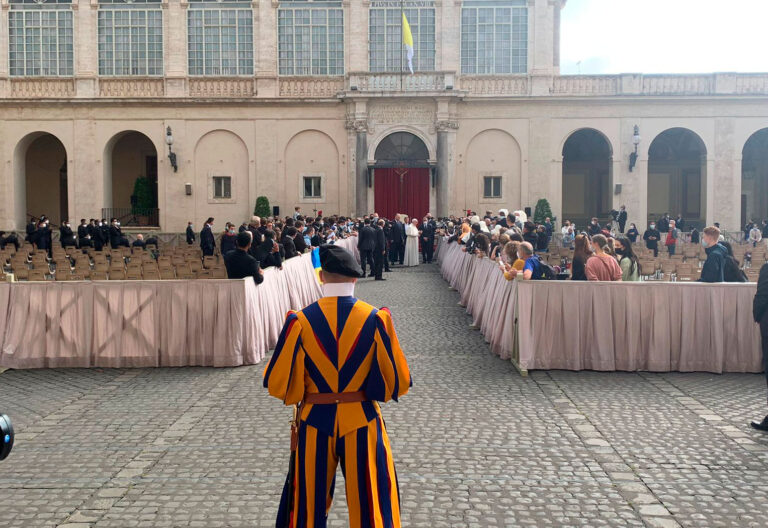 Francisco vuelve a ofrecer su catequesis en el patio de San Dámaso del Palacio Apostólico ante los fieles, cuya presencia agradece porque “no es bonito hablar delante de una cámara”