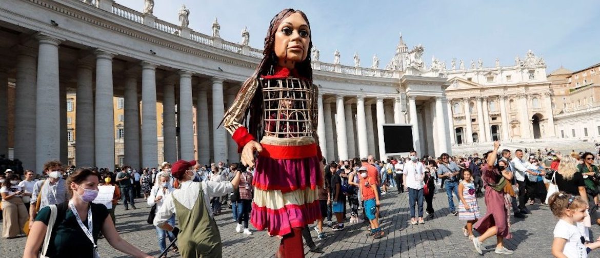 La pequeña Amal ha atravesado fronteras. Desde Siria a través de Turquía, Grecia, Italia, Francia, Suiza, Alemania y Bélgica “en busca” de su madre. En muchas aldeas y pueblos ha sido recibida por artistas de todo tipo –bailarines, cantantes, cineastas, pintores–, así como por líderes civiles y religiosos cualificados. La intención clara de dicho viaje, y que recojo y me emociona al enterarme, era representar el viaje de tantos pasos que han sido dados por los millones de personas que han sido desplazadas violentamente por la guerra o la persecución, los desastres naturales (muchos de ellos provocados por la acción humana) especialmente los niños. En este momento de múltiples crisis globales, el mensaje urgente de Amal al mundo es “no te olvides de nosotros”.