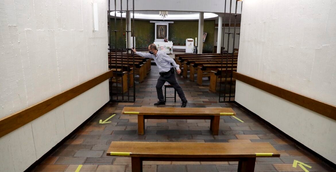 Marcas de recorrido obligatorio en la parroquia de Nuestra Señora de Guadalupe, en Madrid. EFE/Ballesteros