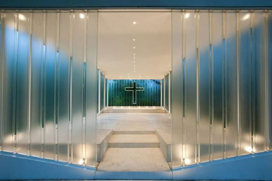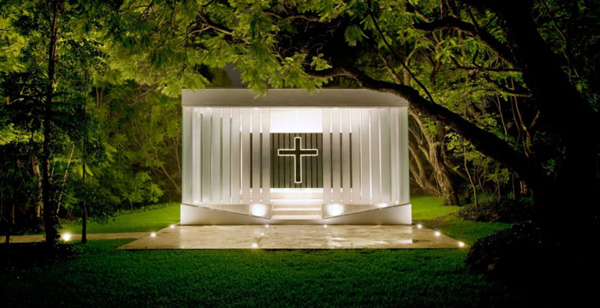 Un primer problema que presidió el diseño fue el calor de la zona. Una segunda condición fue la conciencia ecológica de los arquitectos, que rechazaban sistemas de aire acondicionado y pretendían el menor impacto en el entorno. Finalmente, se habilitó esta propuesta: una capilla con un cerramiento formado por láminas de cristal separadas diez centímetros de modo que el aire circula y plantada bajo una enorme jacaranda, árbol típico de la región, que protege a la capilla del Sol durante todas las horas de calor.