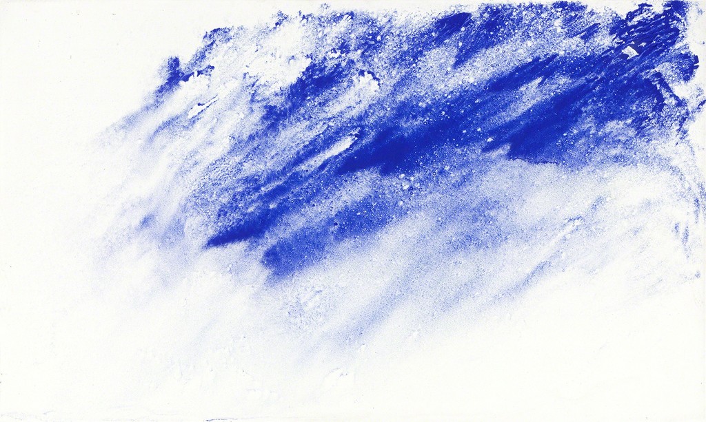 Fujimura deja parte del cuadro con una superficie terrosa, la textura de un seco satélite lejano, los terrones desechos de un suelo estéril, una minúscula resistencia de la tierra sobre la que se abalanza la gran explosión azul del Terremoto de Fukushima.