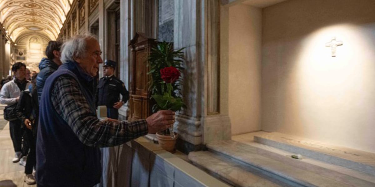 Ver las imágenes en medio de la oscuridad del templo del túmulo funerario impresionan. Una luz apunta directamente a la lápida de mármol procedente de la Liguria que tiene escrita la palabra “Franciscus” en mayúsculas. En la pared lisa hay una reproducción de la cruz pectoral que utilizó el Papa, la cruz que podríamos decir representa al Buen Pastor. Esta cruz tiene el tamaño justo para que no desentone en la sobriedad del conjunto.