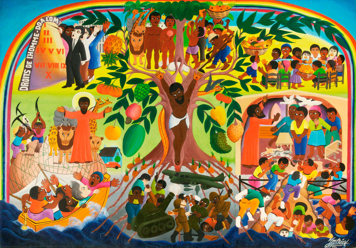 Jacques Chery (Cap Haitien 1928). Pintó en el año 1982 un mural para la organización alemana Misereor. El mural titulado el “árbol de la vida” sitúa al espectador ante varias escenas en las que se alternan los frutos de la comunidad y la solidaridad y los frutos del individualismo y la codicia. Lo interesante de este mural es que tanto en unas como en otras escenas aparecen personas que toman posturas a favor y en contra tanto de la acogida como de la explotación. En su obra también aparecen representados los que se cruzan de brazos, los que se divierten ante el dolor de los demás… y en todas las escenas, Jesús de Nazaret identificándose con los que comparten, con los que se implican en la ayuda a los demás, con los que son oprimidos. Un Cristo racializado. Un Cristo negro. En la parte superior izquierda del mural, como si fuera el frontispicio de un edificio aparece representada la Declaración Universal de los Derechos Humanos.