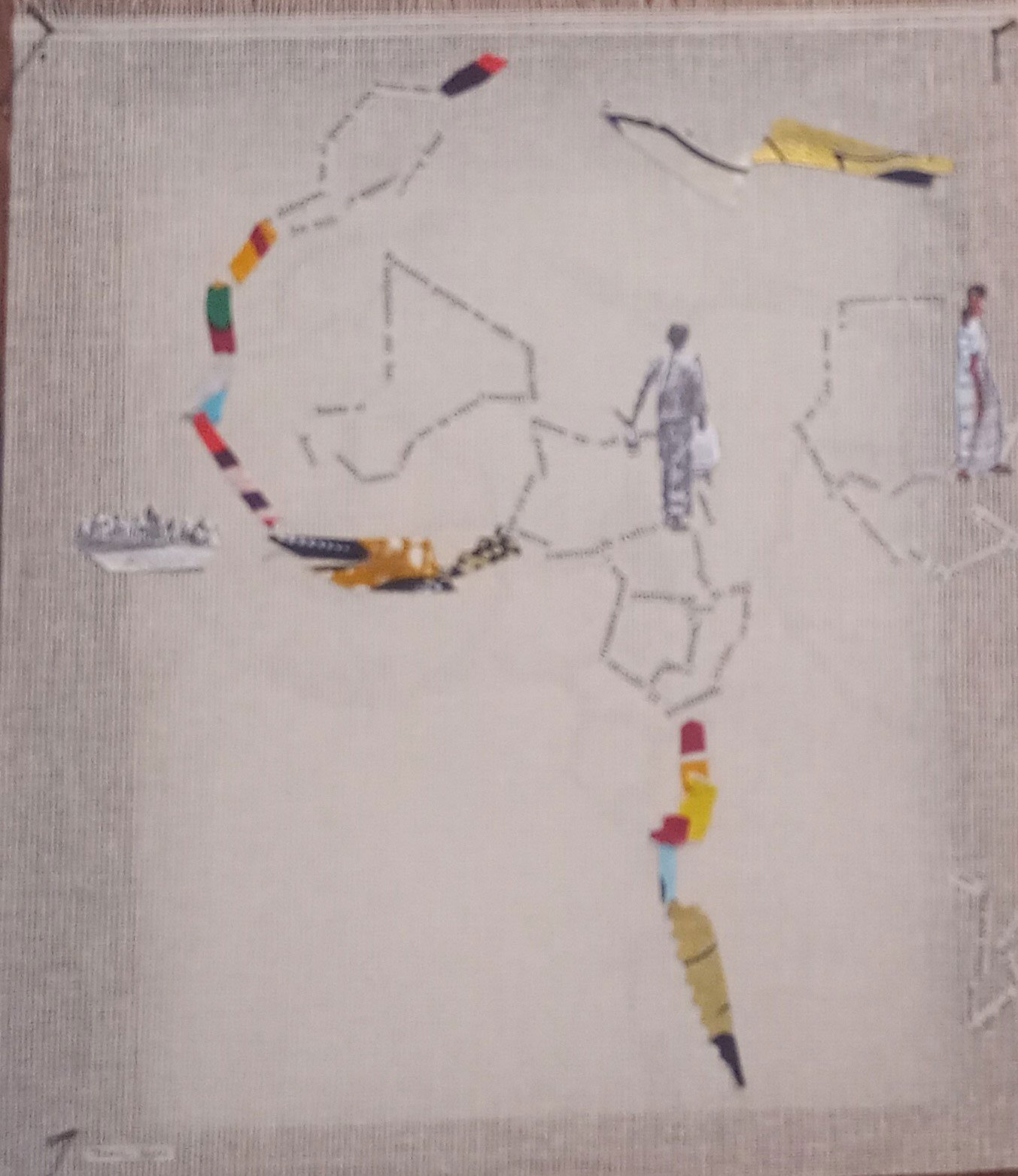La artista plástica Teresa López destaca por llevar a través de sus obras, el compromiso con comunidades de Benín y Senegal a través de la organización Afroyeyé en la que ella milita. Teresa es una artista que experimenta con materiales y texturas y a través de su serie denominada “Fronteras” denuncia las condiciones de opresión que empujan a tomar la decisión de emigrar. Ella pinta mapas de África distinguiendo aquellos territorios que están en conflicto de aquellos que no lo están. A los primeros los delimita con recortes de periódico en blanco y negro mientras que las fronteras de los segundos aparecen señaladas con papeles y texturas de colores. En los primeros aparecen figuras de personas emigrando. Mujeres, hombres, niñas y niños… y en el mar, pateras. En los segundos no aparece figura alguna. Ella, misma a la hora de explicar sus cuadros afirma que se inspiran en Africa: “En la pobreza y belleza que he visto allí y que dejan los que tienen que salir apresuradamente por guerras, sequías o hambrunas”.