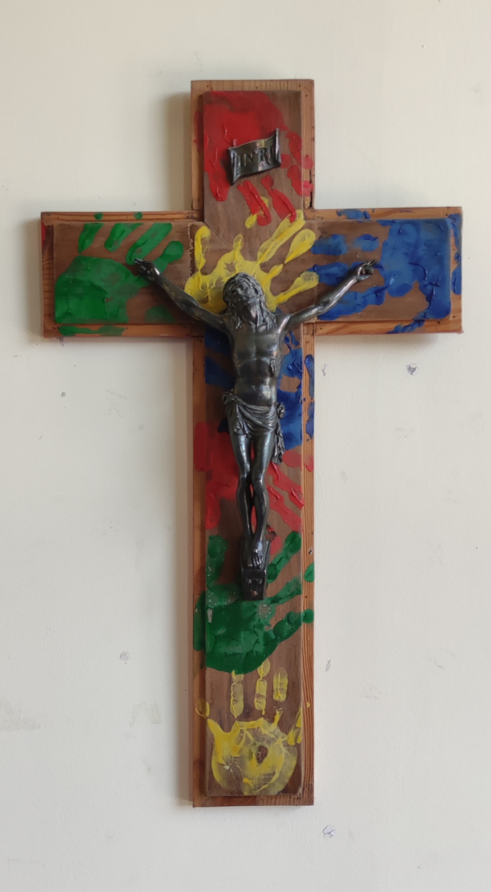 En la entrada de las instalaciones que Cáritas tiene en La Fábrica de Muebles de la Cañada Real Galiana de Madrid, preside el distribuidor un antiguo crucifijo de madera, de esos que todavía nos acompañan en algunas aulas de colegio. Alguien decidió decorarlo con las huellas de color de las palmas de las manos de algunos niños: Jesús pende crucificado de un madero multicolor.