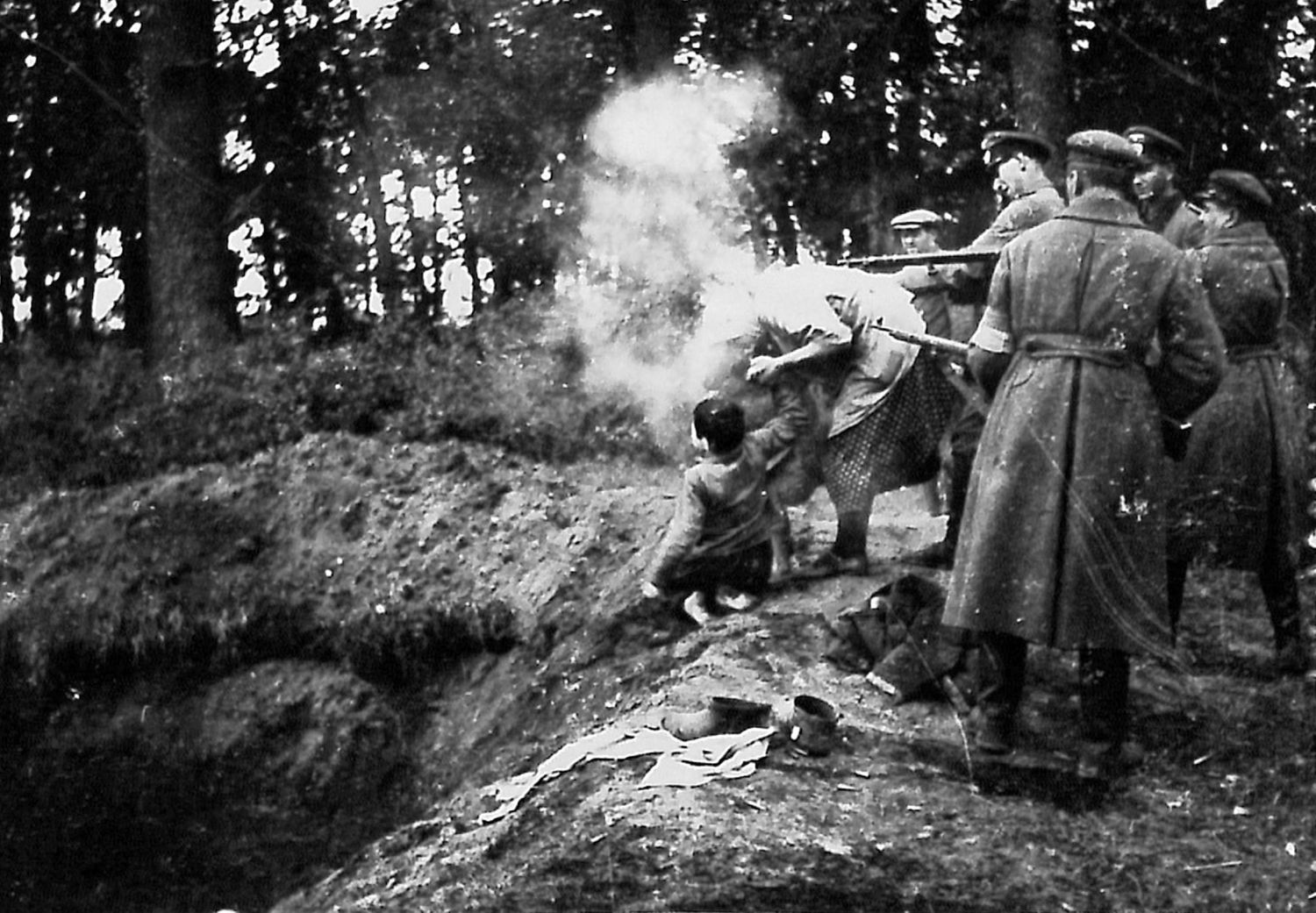 Dos soldados alemanes –soldados de la Wehrmacht y no de las SS– supervisan complacidos. Hay un testigo civil. Los ejecutores sonríen, evidenciando la satisfacción que les produce su crimen. No disparan a los niños para ahorrar munición. La madre les arrastrará en su caída y, con suerte, se asfixiarán entre los cadáveres. Si no es así, serán enterrados vivos. Una nube de polvo blanco refleja los disparos, ocultando el rostro de la víctima. Se trata de una fotografía clandestina realizada por el soldado eslovaco Lubomir Skrovina.