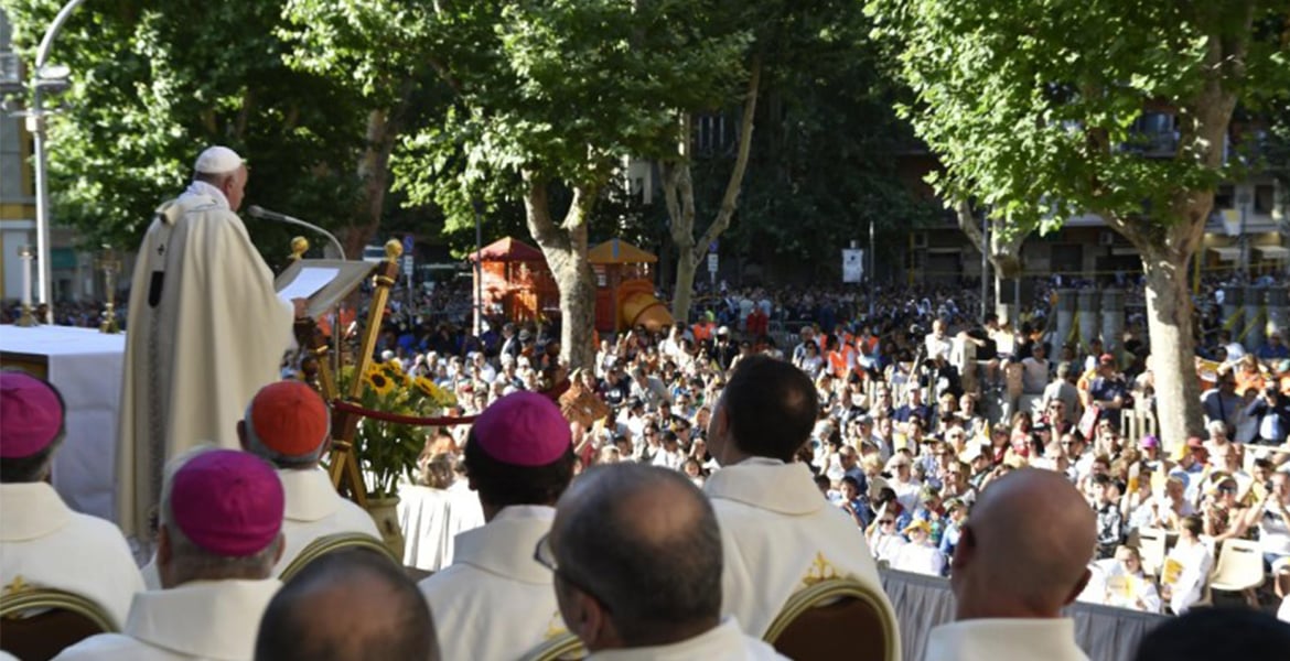 Y ahí ha ido el papa Francisco, ha celebrado la misa en la plaza frente a la parroquia y ha dejado que sea el cardenal vicario para la diócesis de Roma, Angelo De Donatis, el encargado de acompañar la custodia con el Santísimo Sacramento por las calles cercanas al templo –que, como la mayoría de las manzanas cercanas llevan nombres de los generales del Risorgimento o de las guerras coloniales italianas –, verdadero corazón del barrio.