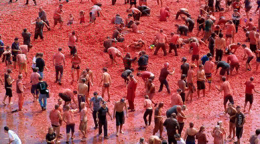 No es infrecuente que en algunas fiestas populares se derrochen alimentos. Así, el último miércoles de agosto, en Buñol (Valencia), se celebra la Tomatina, en la que se tiran miles de kilos de tomate. O la fiesta de los “Enfarinats” de Ibi (Alicante), donde el 28 de diciembre se utilizan toneladas de harina y cientos de docenas de huevos como arma arrojadiza. O la batalla del vino en Haro (La Rioja), el 29 de junio, con miles de litros de vino que tiñen de rojo a todos los asistentes.