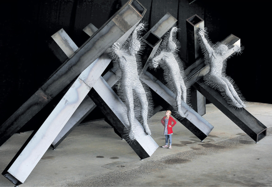 Mach ha tomado la forma de las estrellas antitanques que los ejércitos plantan en tierra de nadie de cualquier guerra y parece que esos hombres fueran inmolados en esa batalla. Parecen árboles derribados con su “extraños frutos” colgando goyescos como expresión de lo más oscuro a lo que en el hombre se puede descender. Son cruces que no se elevan a lo alto sino que no se alejan de la tierra. Juntas forman el cuerpo derruido de un viejo astillero de donde botaron las barcas de los pescadores.