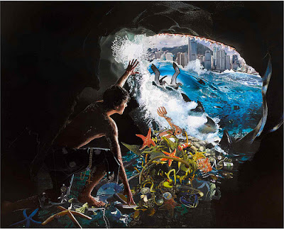 Que Jonás lleva mucho tiempo en el interior del Leviathán se deja ver por un ingenioso detalle: en su cuerpo –como en el de los grandes cetáceos– se han adherido moluscos blancos. Extiende su mano izquierda para defenderse de la espuma que lanza contra él una ola. Mach traza una asociación muy común entre Jonás y Pinocho: en la mancha de objetos que hay en el suelo de la caverna-boca podemos ver un brazo mecánico articulado en la zona más exterior. En el resto de residuos distinguimos una mezcla de criaturas marinas –algas, estrellas, conchas– y objetos artificiales –junto con el brazo de muñeco, un bidón, latas, una bandeja, un tubo y una botella de oxígeno, un patito amarillo de juguete o un collar–.