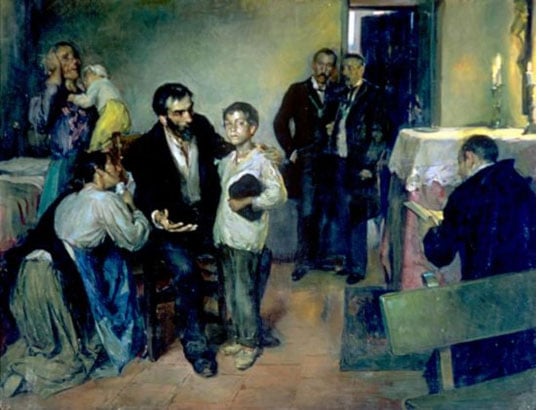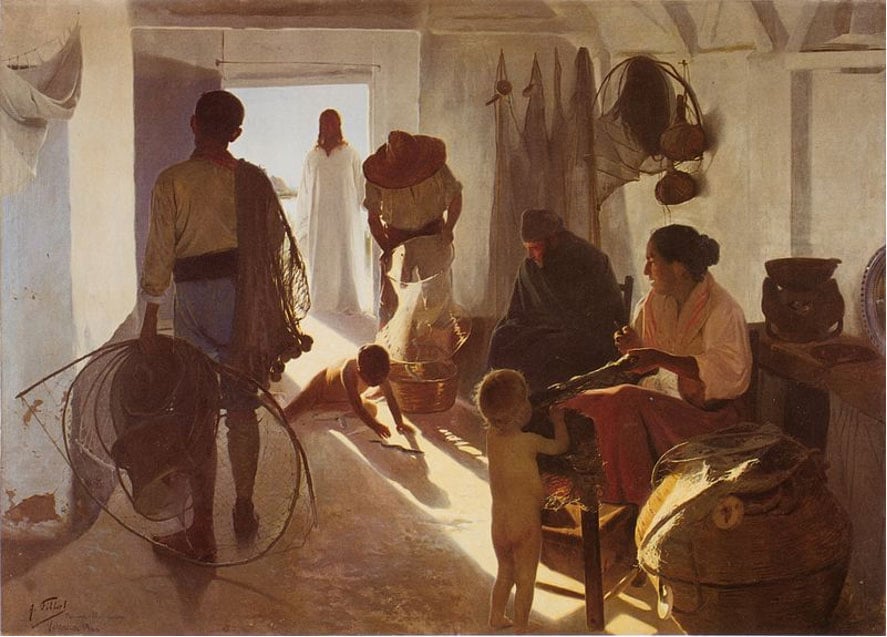 Otra pintura cuyo arte y espíritu son muy difíciles de captar sin estar ante el mismo cuadro porque el contraste entre el Jesús iluminado de la puerta y la penumbra de la barraca a la que se asoma es enorme y ahí reside el mensaje. Jesús aparece resplandeciente en la puerta de una barraca pescadora de niños desnudos, un hombre enfermo abrigado, donde un hombre echa las anguilas recién pescadas, otro ha recogido los aparejos y una mujer repara las redes. Jesús era especialmente amigo de pescadores.