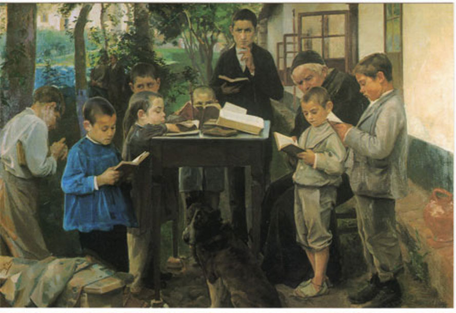 Un grupo de niños rodea una mesa, cada uno con su libro, sobre el que un cura les enseña a leer. El cura está sentado y su gesto lo muestra amable, paciente y humilde. Capta mi atención un niño pequeño que apenas alcanza la mesa, apoya la barbilla sobre la tabla, pero quiere leer, está tremendamente concentrado hilando letras y palabras; parece que las respira. Y cada palabra que avanza, suma días y más días a su esperanza de vida.