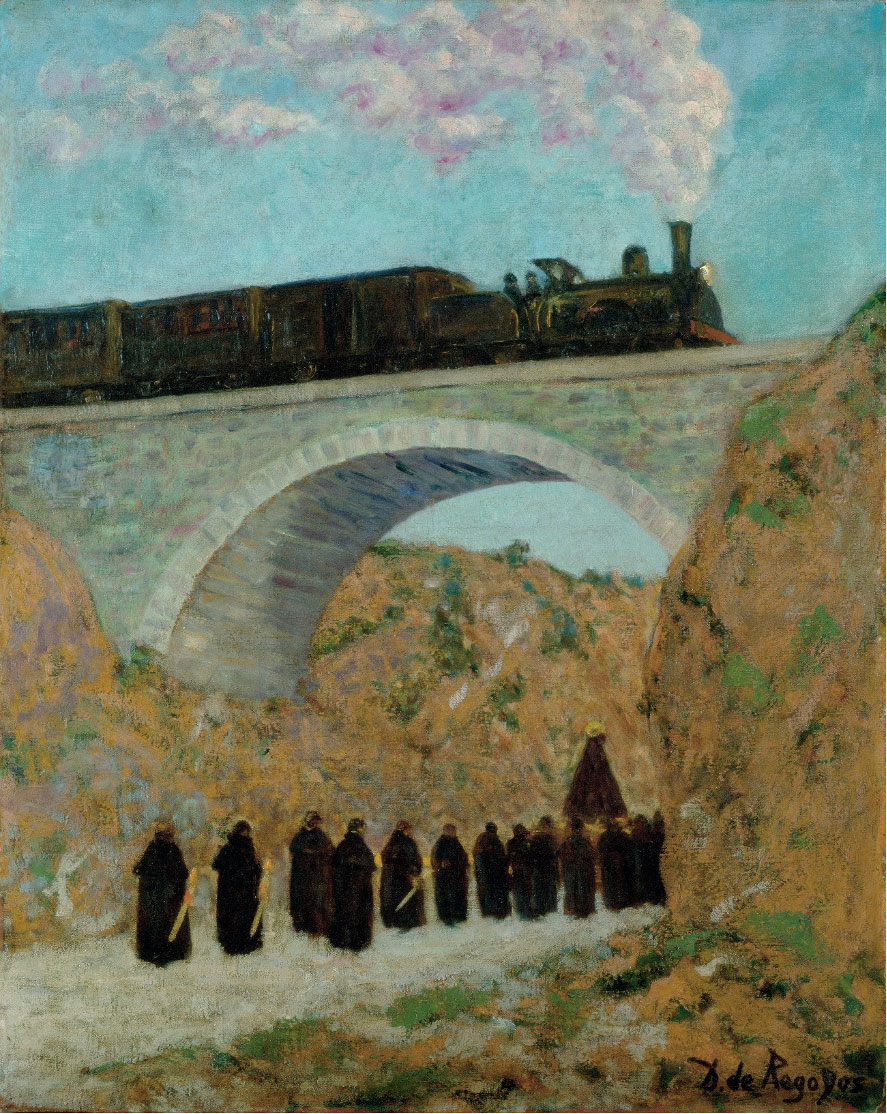 El rebelde pintor asturiano Darío de Regoyos ofrece en esta pintura de claro simbolismo una imagen de la España Negra, con un claro mensaje sobre el progreso. Un tren negro atraviesa un viaducto echando una estela de humo blanco que indica la alta velocidad de la locomotora. Bajo el puente y perpendicular al tren, avanza una fila de oscuros monjes procesionando una Virgen mientras sus velorios arden. El camino blanco que recorren hace la misma función que el humo, aunque la pista transmite pasividad y lentitud.