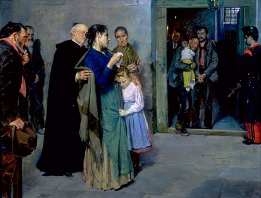 Una de las tres obras que el Prado expone dedicadas a la ejecución de anarquistas está firmada por el pintor valenciano Manuel Benedito, cuya célebre familia se dedica todavía a la taxidermia. El condenado aparece en la puerta de la prisión, a punto de ser conducido al patio de ejecución. Su padre anciano con su bebé nieto en brazos, abraza con su izquierda al hijo, su cabeza en su hombro llorando. Tremenda imagen de amor y desgracia de tres generaciones de hombres. El preso conmovido y grave, su padre mayor desconsolado, hecho amor desecho. Su esposa lo mira desde el patio con su hija agarrada y metida en su falda. Solo un cura la consuela o conforta compasivo, sujetándola para que no caiga.