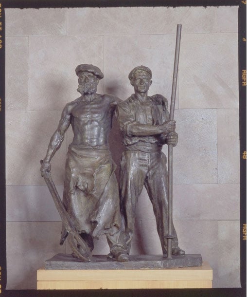 Ambos posan con las piernas abiertas y orgullosos. Parecen dos guerreros. Uno abrirá las tripas a la materia hecha titán, el otro la fundirá hasta rendirla. Pero ambos parecen venir de la Guerra de Troya, y sin embargo muestran respeto como si la cosa fuera un animal glaciar a la que deben rendir honor. Su victoria ha asumido el poder de la materia tras haberse desposado con ella. De 1986 es la escultura en escayola y este bronce es un vaciado posterior. Imagen de Wikimedia Commons.