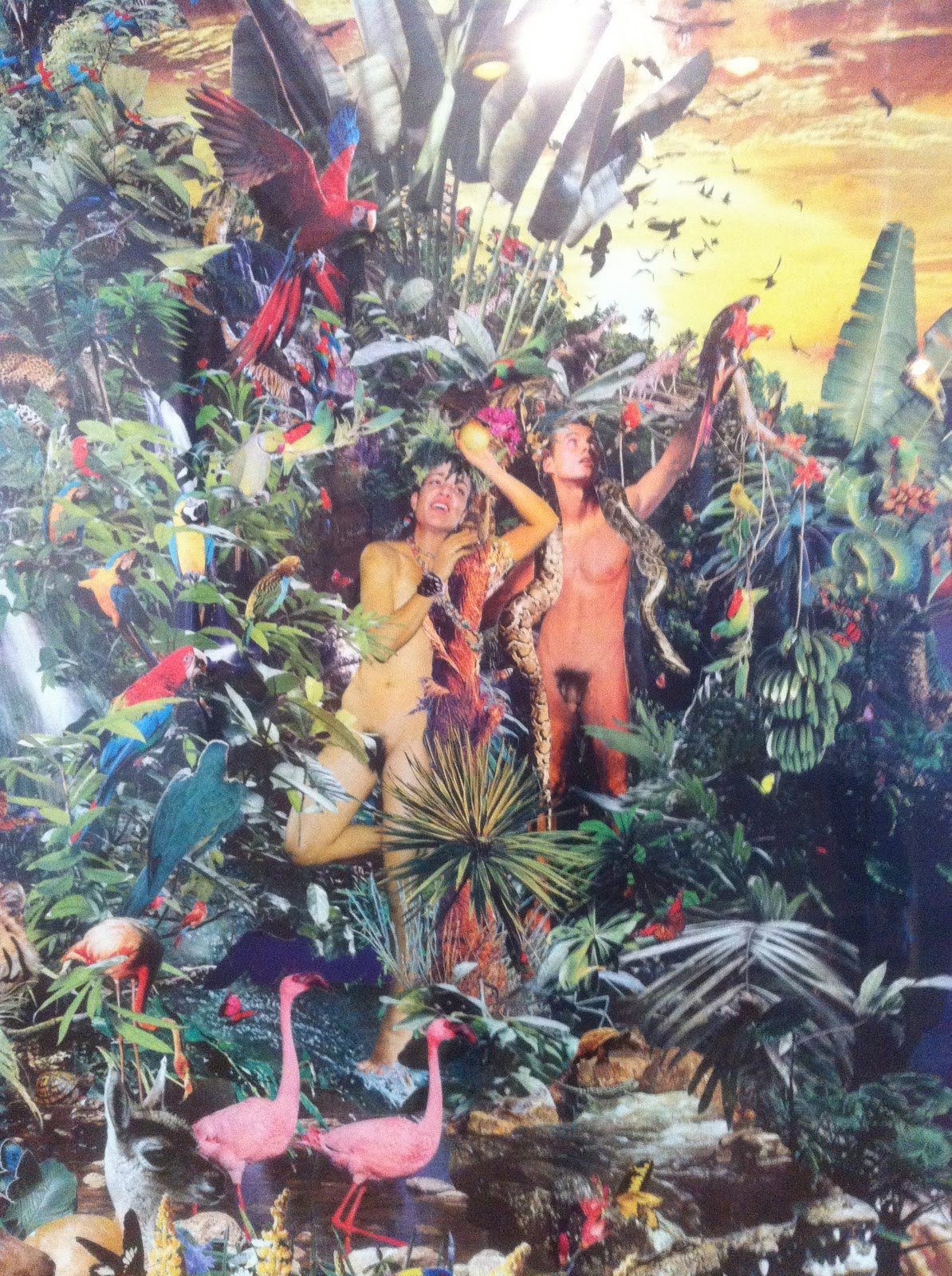 Adán y Eva actúan como recién llegados señalando una novedad tras otra. Sus brazos en alto expresan asombro y alegría. Eva se adelanta en su exploración y toma en su mano izquierda una manzana amarilla. Mientras, Adán está plantado en un lugar posando un ave precisamente del paraíso también en su mano izquierda. El sexo de Eva es ambiguo.