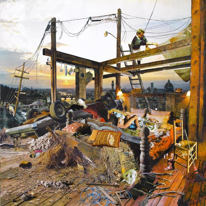 La Virgen María acaba de dar a luz y reposa desnuda de cintura para abajo con su cría al pecho. La imagen que recortó muestra aún los signos de gravidez. Está recostada en una cama convencional de gruesos soportes ornamentados, pero lo que la cubre es un caos. San José –blanco, rubio, con gafas y vestimenta occidental– trata de construir una chabola apresuradamente pues está anocheciendo. La caseta que trata de construir está ubicada en una escombrera de las afueras de una ciudad en la que podemos reconocer a Florencia por la cúpula de Santa Maria del Fiore y los puentes sobre el río Arno.