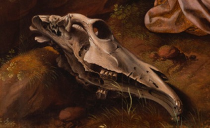 En la esquina izquierda, como una última firma, como el destino hacia el que va Carlos, está la quijada de caballo, y muy probablemente el emperador veía en esa quijada a su fiel Determinado. Como él, entregará un día Carlos su calavera al pie de la Cruz, y quizás cuando veía este cuadro sentía el consuelo de, como los viejos guerreros celtas, yacer junto a su querido caballo.