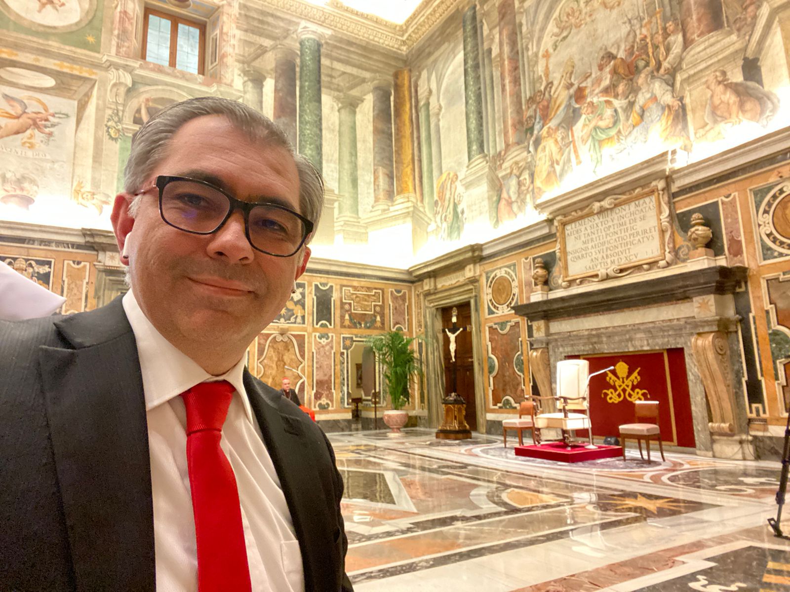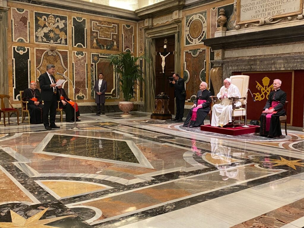 Pero los ‘buenos samaritanos’ también existen en la Sala Clementina. Lucas Luzón, un ecuatoriano que trabaja en el Vaticano desde hace más de 20 años, se dio cuenta cuando me disponía a ubicarme en la segunda fila –justo detrás de los prelados– y se apresuró a decirme que al otro lado quedaba un puesto en la primera fila. En menos de 30 segundos ya estaba allí, en la última silla de la improbable primera fila, junto a una gran puerta. Al mi lado estaban dos religiosas, una keniana y una italiana –a la que el Papa se referiría luego en su intervención–, ambas también son consultoras del Dicasterio para la Comunicación.