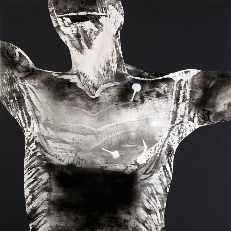 El cuerpo radiografiado del Crucificado hace aparecer esos planos superpuestos tan característicos y sugerentes de Yaloza. Como en Bautismo, la artista envuelve la figura con una difuminación fluorescente que nos hace acercarnos desde el misterio y lo liminal. La composición técnica del cuadro impide que poseamos con nitidez la imagen, nos obliga a unir distintos planos compositivos. Una buena pedagogía en un mundo que tiende a escindir los planos interiores de las cosas y las criaturas.