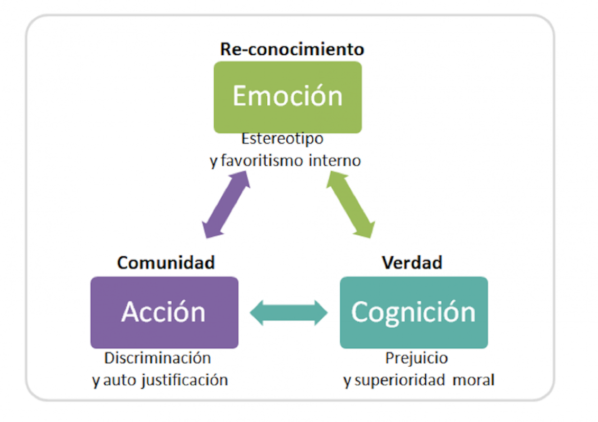3) Acción. Emociones ancladas y razonamientos previos generan convicciones que nos impulsan a la acción. Afirman nuestra identidad y al encontrarnos con quienes piensan como nosotros, nos organizamos en grupos de acción o justicia social. No únicamente reforzamos nuestra perspectiva de grupo, sino que clasificamos a grupos enteros de gente como hostiles y esto nos lleva a actuar colectivamente hacia la lucha o el rechazo. Así, se cierra el ciclo. La discriminación se vuelve algo perfectamente factible en cada uno de nosotros, que somos gente de buen corazón, razonable y amigable. Sin embargo, nuestro interactuar colectivo es defensivo, distorsionado y hostil. Y los otros, al percibir nuestro rechazo, refuerzan sus propios estereotipos, prejuicios y acciones de discriminación.