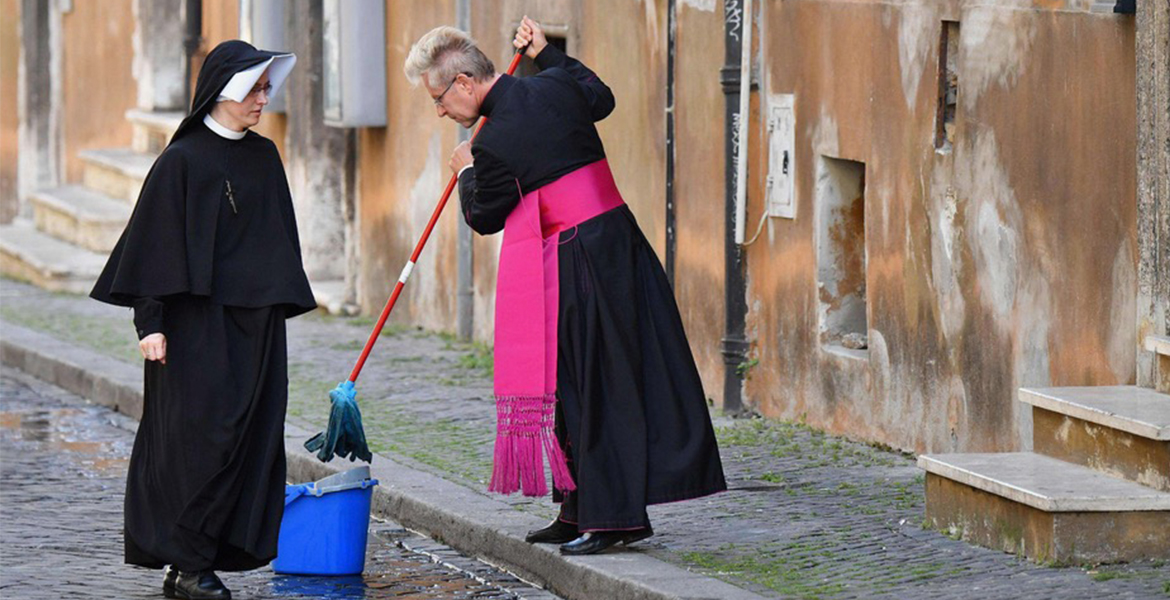 El diario italiano Avvenire, propiedad de la con Conferencia Episcopal, ha elegido una foto de la agencia italiana ANSA para ilustrar la celebración. Además de mostrar el templo con un número reducido de fieles, en la acera encontramos a un monseñor y a una religiosa de las Hermanas de Nuestra Señora de la Misericordia –congregación de santa Faustina– a juzgar por la característica forma de llevar la toca. El prelado, que está con la fregona en mano dando una pasada a los alrededores de la iglesia, es el rector del templo, Josef Bart. Una Iglesia que sirve, “mordiendo” en las verdaderas realidades cotidianas, como decía el obispo Jacques Gaillot en su famoso bestseller ‘Una Iglesia que no sirve, no sirve para nada’.