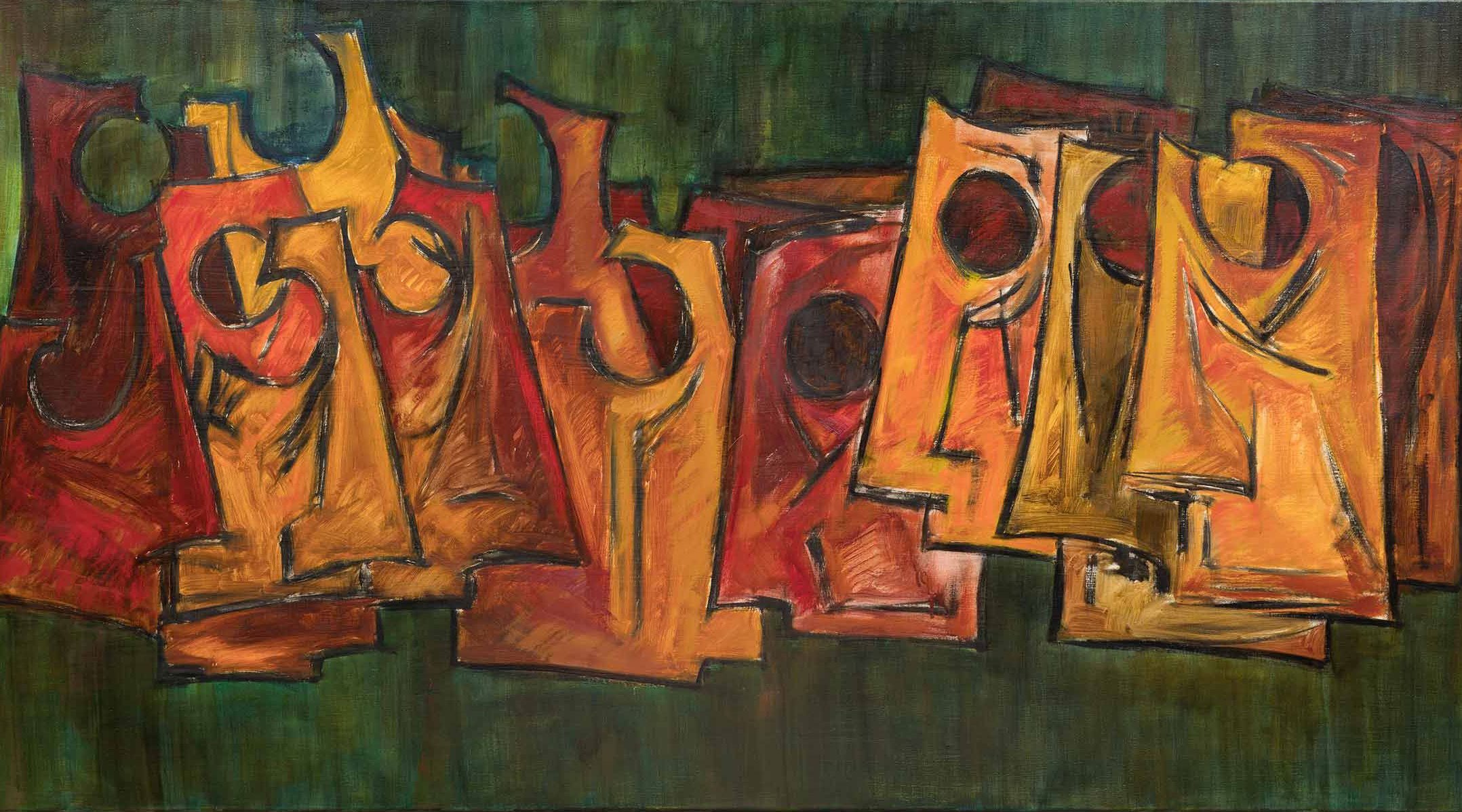 Otro cuadro es una tabla horizontal de dos metros por un metro aproximadamente. De nuevo un rostro chamorrano se encuentra ante un mundo primordial, un fondo de rojos primigenios —que estaban en la tabla que encontró casualmente y aprovechó— y oscuridades. También puede ser un mundo que se oscurece y amenaza. En todo caso, el rostro herido no es algo nuevo, sino que es una herida esencial que está desde el inicio del ser humano. La herida es una estructura constitutiva de nuestra naturaleza.