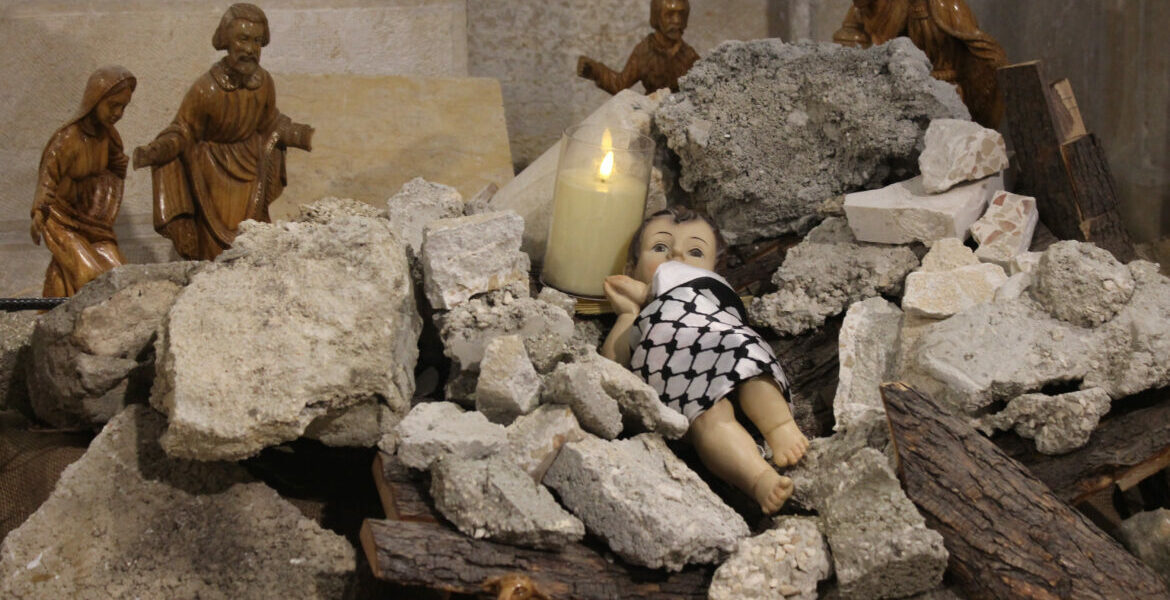 Un Niño Jesús, en una iglesia de Belén, acunado entre los cascotes producidos por los ataques israelíes. EFE/ Luis Ángel Reglero