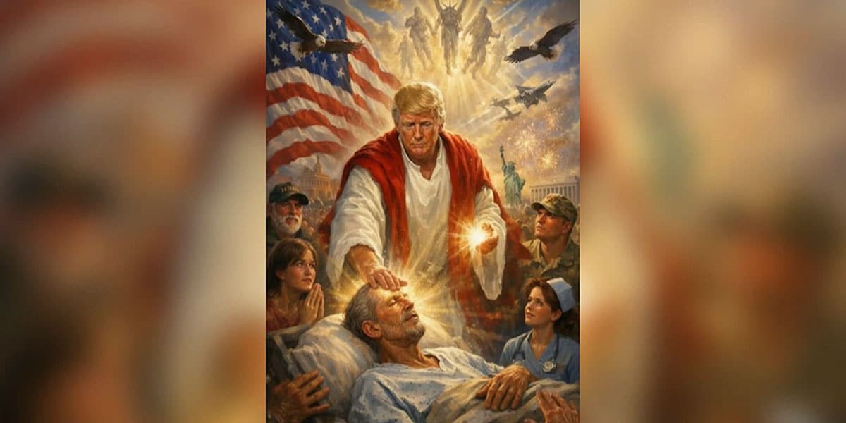 Circula, además, una imagen inquietante y reveladora: una representación del presidente norteamericano disfrazado de Jesucristo, con gesto impostado, extendiendo las manos sobre heridos a los que “sana” en una escena casi teatral. No es una blasfemia en el sentido religioso tradicional; es algo más hondo y más triste: la apropiación del símbolo para vaciarlo. Un Cristo sin cruz, sin dolor, sin entrega. Un Cristo convertido en espectáculo banal, en propaganda interesada, en gesto… ¡vacío!